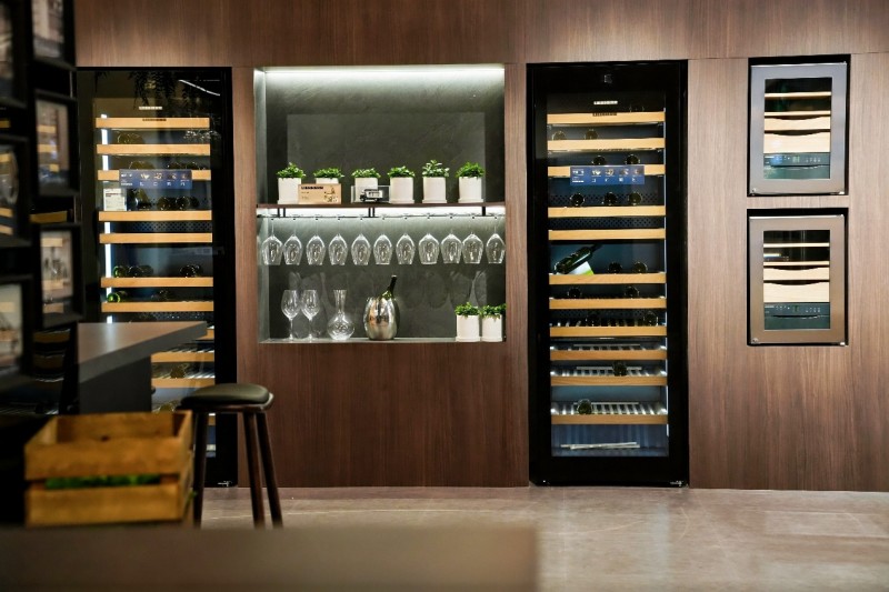 中岛吧台是这场空间叙事的核心。台下式酒柜与冰箱有序嵌入台面之下,让家电成为空间的自然延伸,使用户在流畅的操作动线中,享受烹饪与品鉴的双重愉悦。这种“隐匿的精致”,正是当代高端居所追求的境界:于细节处藏巧思,于无声处见格调。三侧展墙则系统铺陈出利普赫尔的多元产品矩阵,冰箱、酒柜、雪茄柜三大核心品类错落陈列,独立式、嵌入式、台下式等多元安装形态一应俱全,让每一种生活,都能拥有专属的有序与质感。