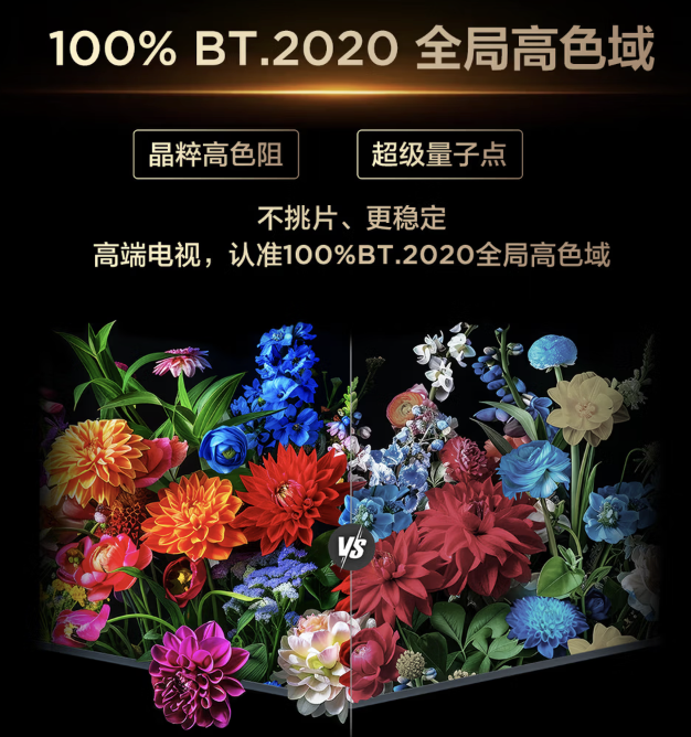 色彩决定画面的丰富度,也直接影响观看舒适度。有些电视为了吸引眼球,会把颜色调得过于艳丽,短时间看很“抓眼”,但时间一长容易产生疲劳;也有部分产品因为色域不足,画面显得发灰、层次不够。更合理的状态,是在高色域覆盖的基础上让色彩既有饱和度,又不过分夸张,尽量接近真实观感。认准能够达到100% BT.2020全局高色域的电视,色彩丰富又耐看。