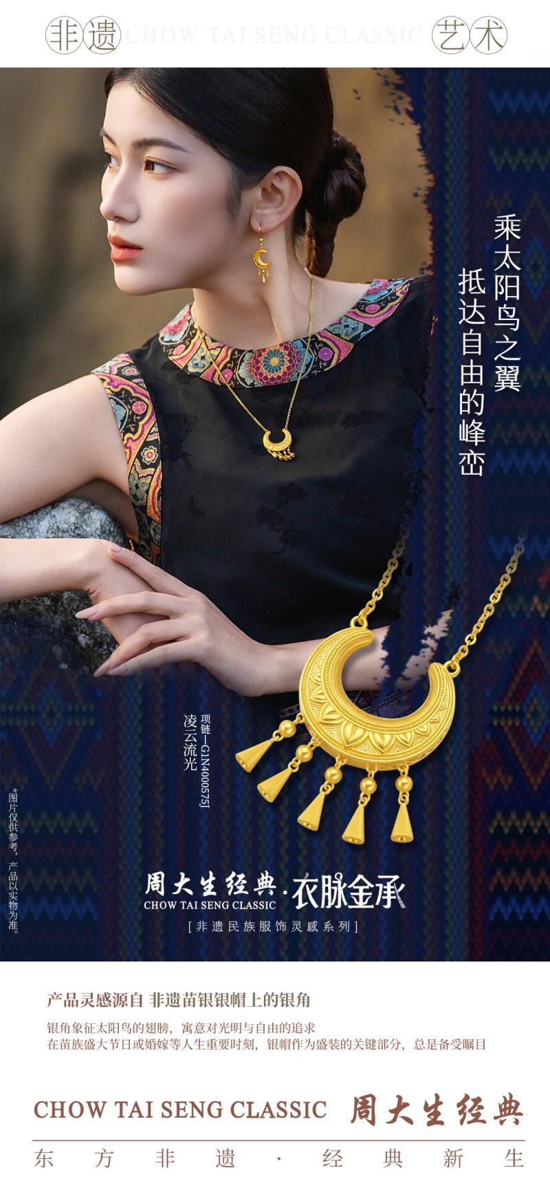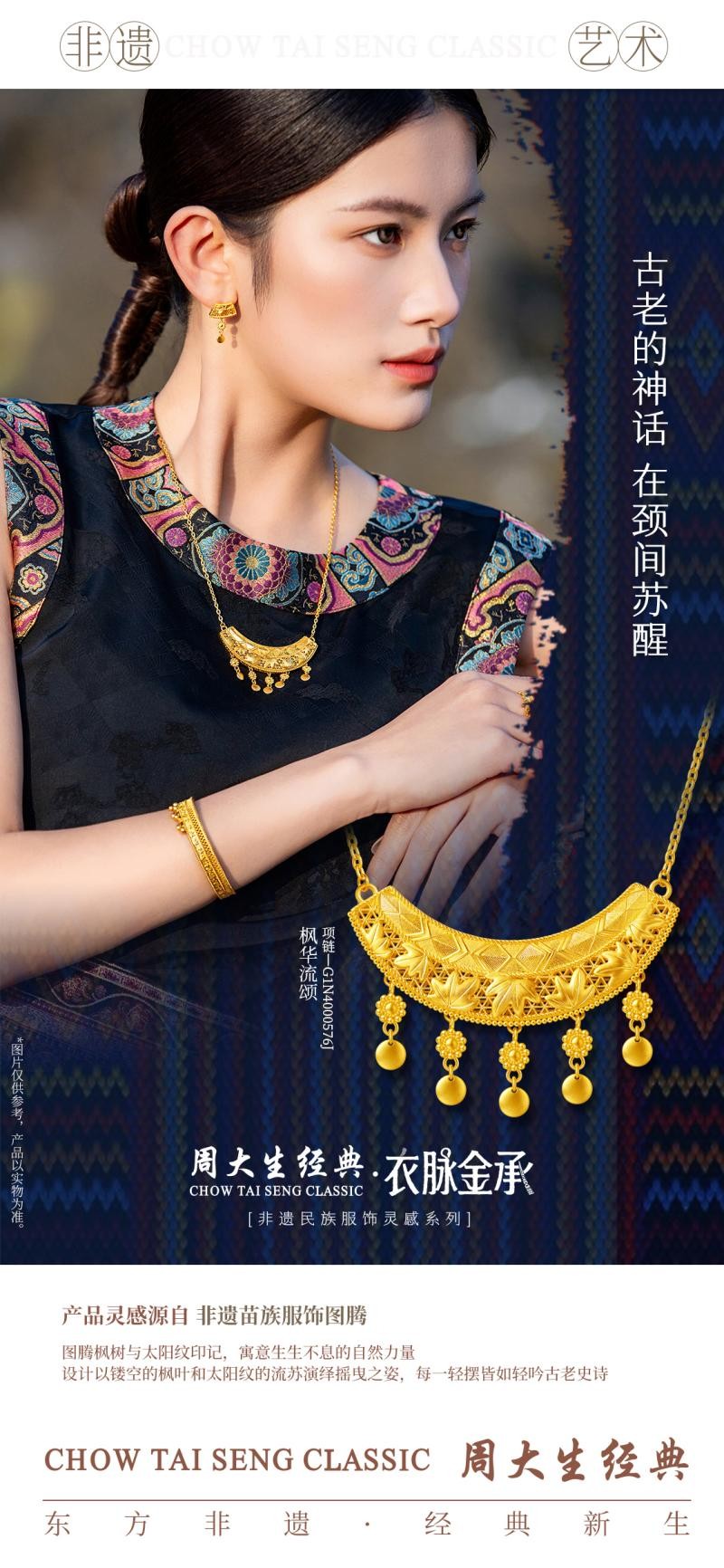 周大生经典用黄金承载的永恒意蕴,来诠释非遗文化的神秘色彩,用现代的设计语言,激活非遗的当代生命力。衣脉金承非遗民族服饰灵感系列的亮相,不仅是一场美学盛宴,更是一次非遗传承的创新实践,让千年民族服饰的匠心与诗意,在当代生活中持续惊艳绽放,让每一位佩戴者都能成为非遗之美的传承者与展现者。
