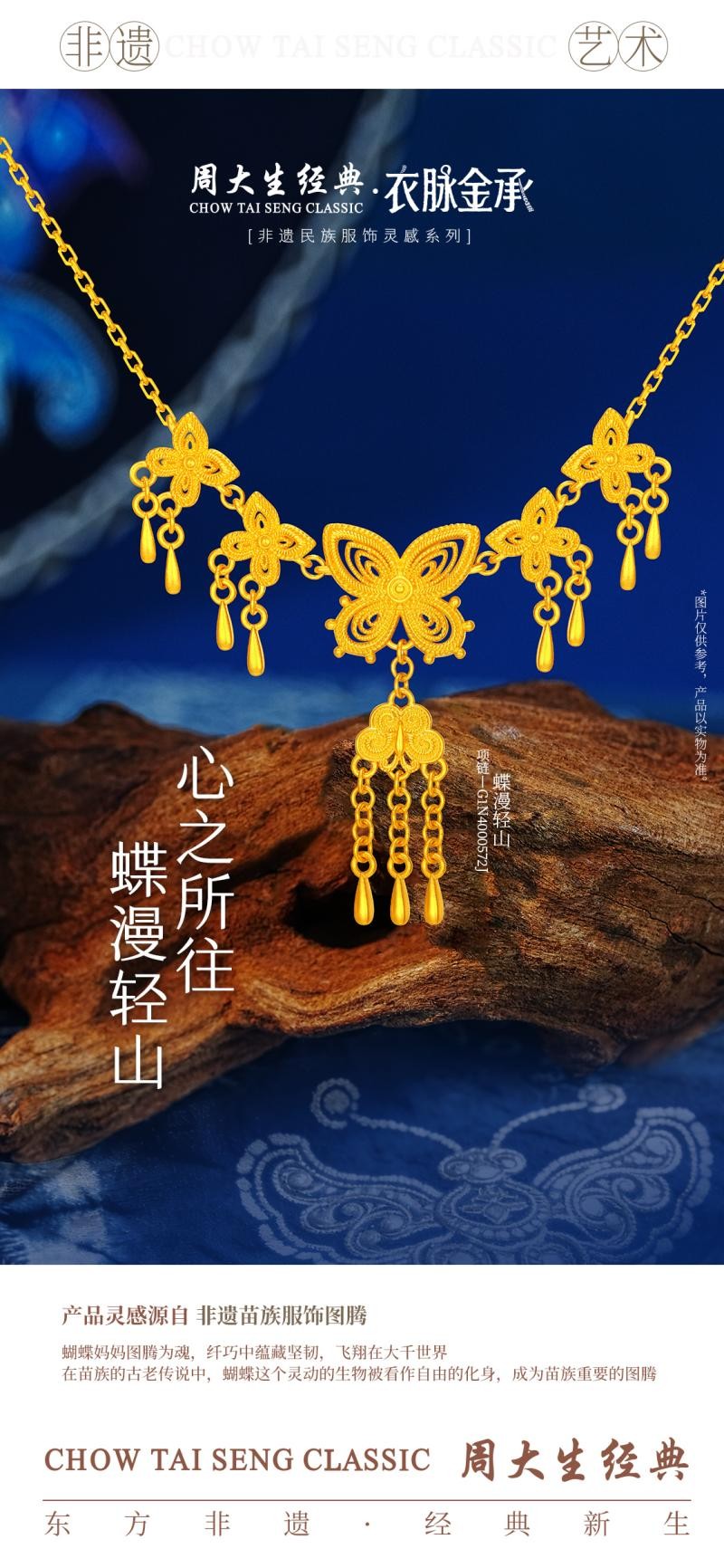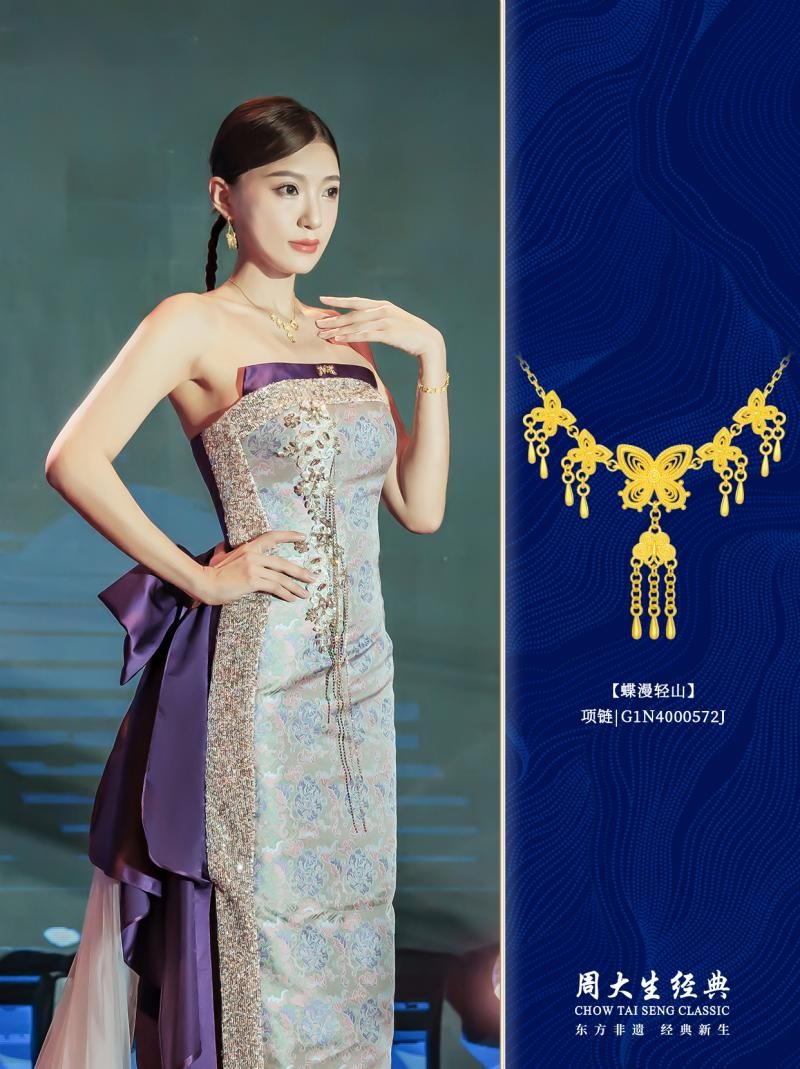 周大生经典“蝶漫轻山”项链以苗族非遗“蝴蝶妈妈”图腾为核心灵感,溯源苗族创世神话,延续苗绣服饰中蝴蝶纹样的坚韧与自由之意。设计师以苗绣的曲线逻辑为基础,用黄金勾勒蝶翼舒展之姿;工艺上,细节处采用非遗花丝扭线工艺,好似在黄金上“手搓”非遗图腾,模拟苗绣的灵动质感,让金面肌理层次丰富,在厚重与轻盈间找到完美平衡。既让非遗基因跃然金上,又以清新灵动的设计融入日常穿搭,成为彰显个性的美学表达。