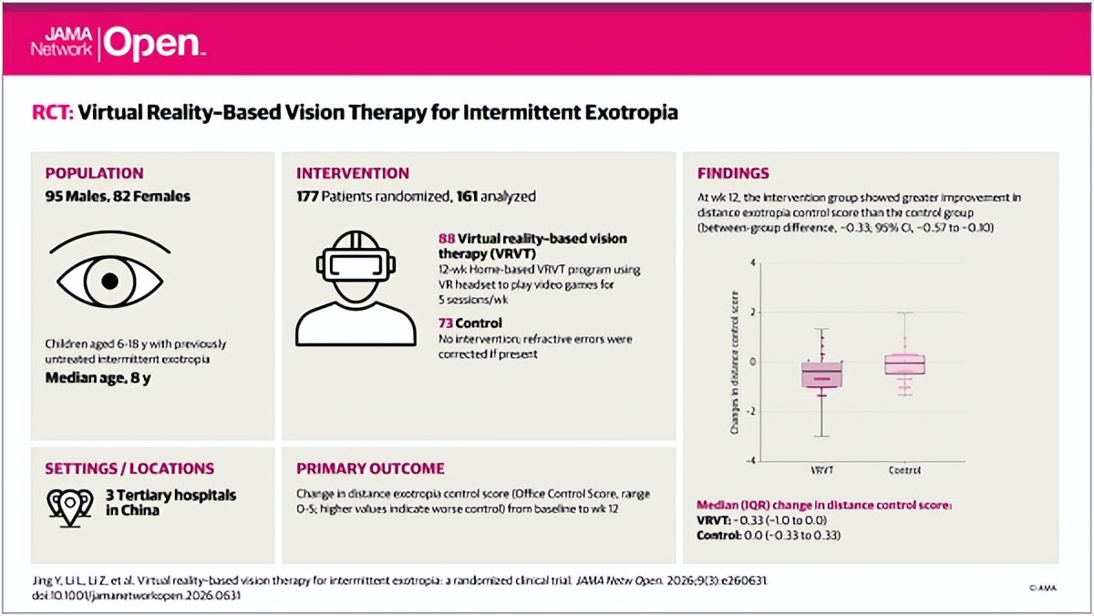而本次发表于JAMA子刊的随机对照试验,首次用高等级证据证实:家庭式VR视觉训练安全有效,为临床提供了手术之外的可靠新选择。