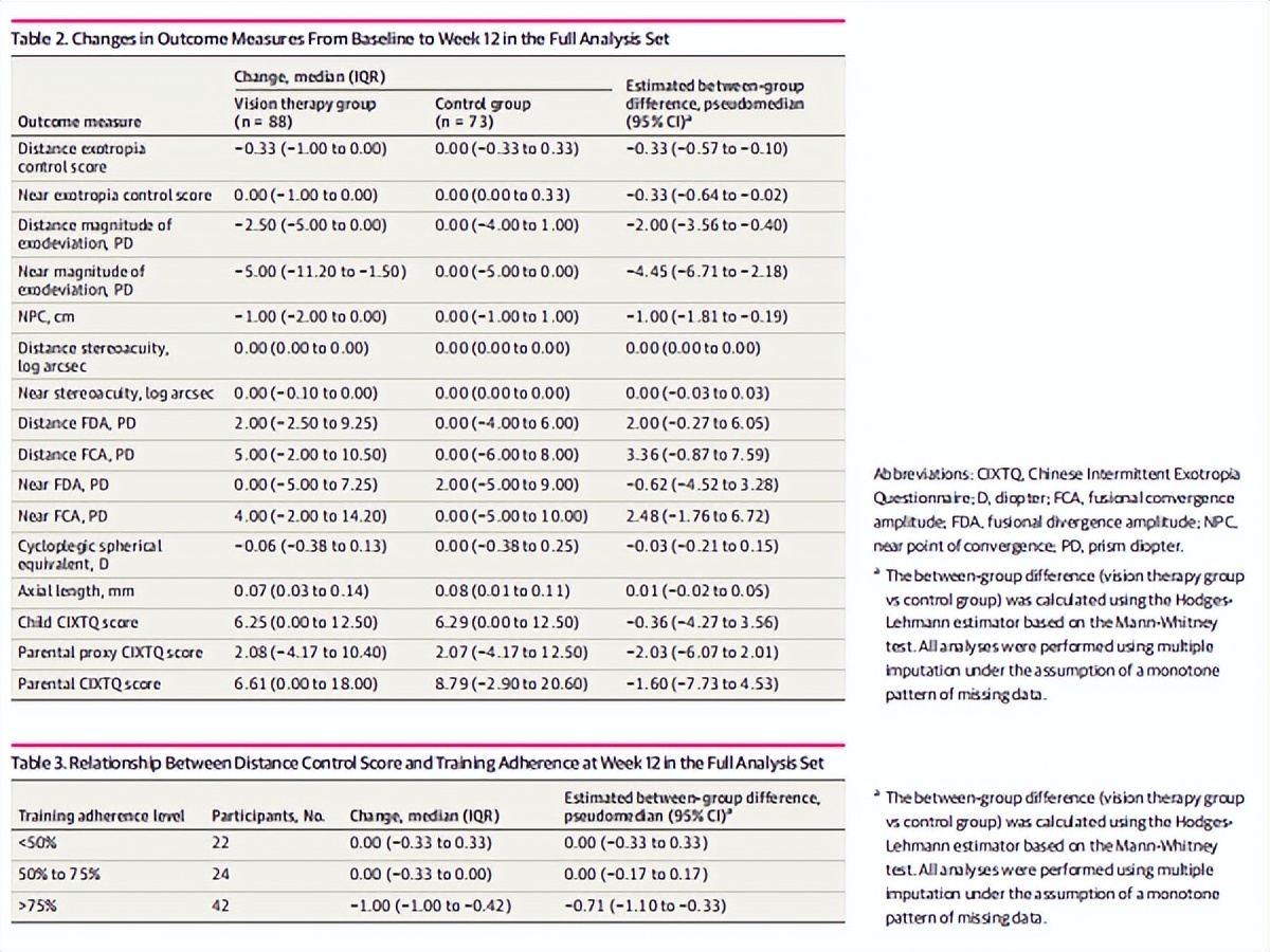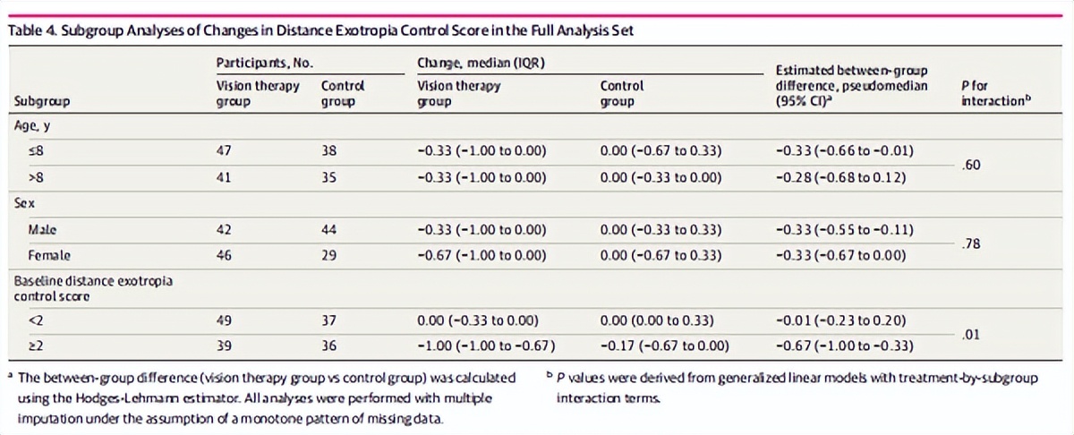 12周后,多宝视VR训练组视远外斜视控制评分中位改善-0.33分,对照组为0.00分,组间差异显著(95%CI:-0.57~-0.10)。