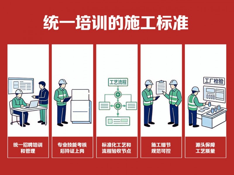 2.统一培训的施工标准:由公司统一招聘培训和管理,通过专业技能考核后持证上岗,严格遵循标准化工艺和流程验收节点,确保施工细节规范可控,从源头上保障工艺质量。