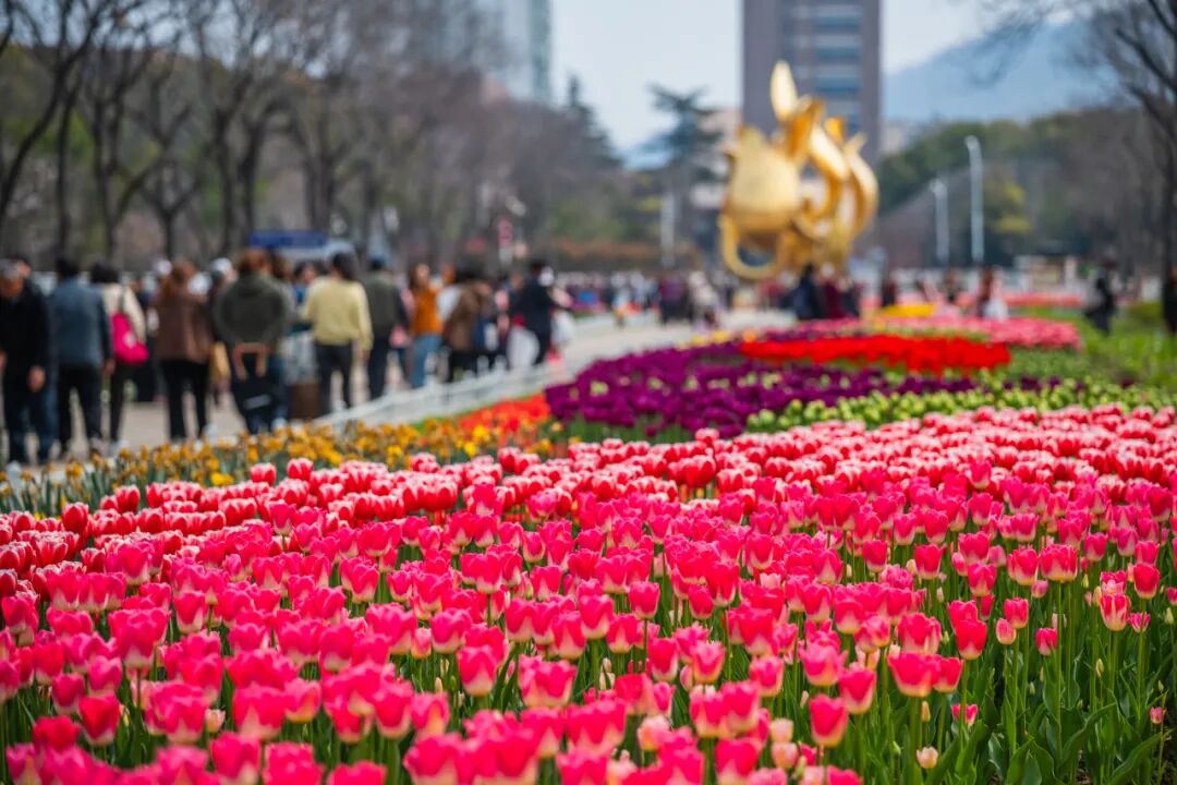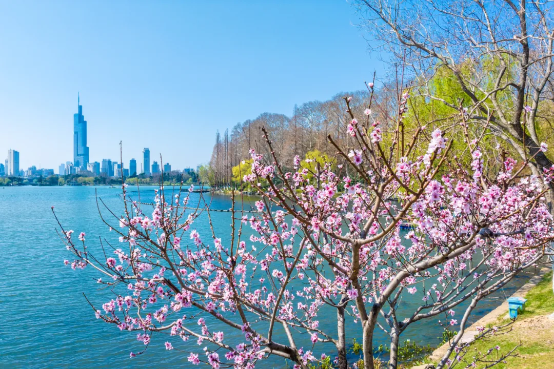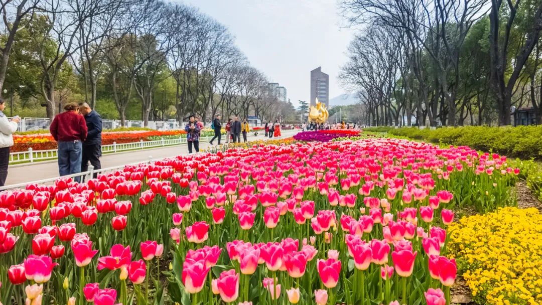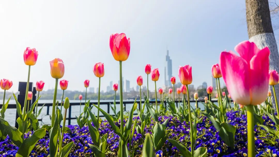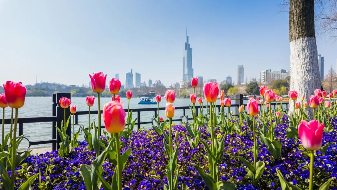 这里郁金香错落绽放、亭亭玉立,与湖面、游船相映成趣,远处紫峰大厦勾勒出城市天际线,湖光、花影、城景完美相融,随手一拍都是氛围感大片。