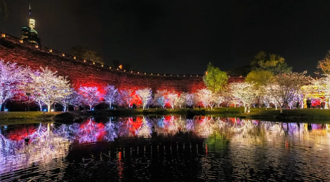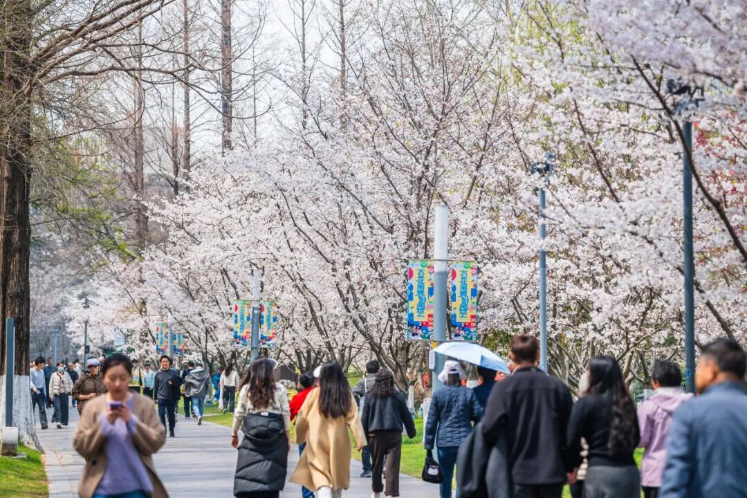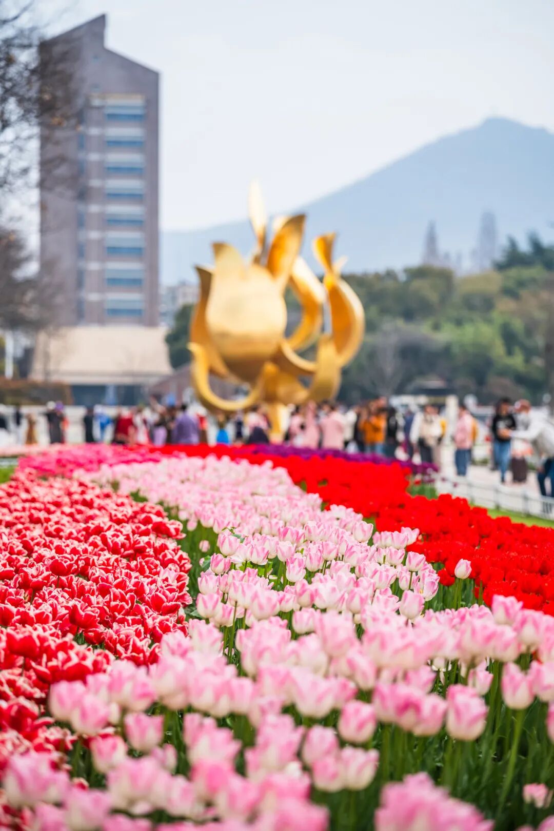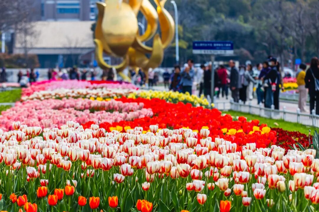 这里郁金香错落绽放、亭亭玉立,与湖面、游船相映成趣,远处紫峰大厦勾勒出城市天际线,湖光、花影、城景完美相融,随手一拍都是氛围感大片。