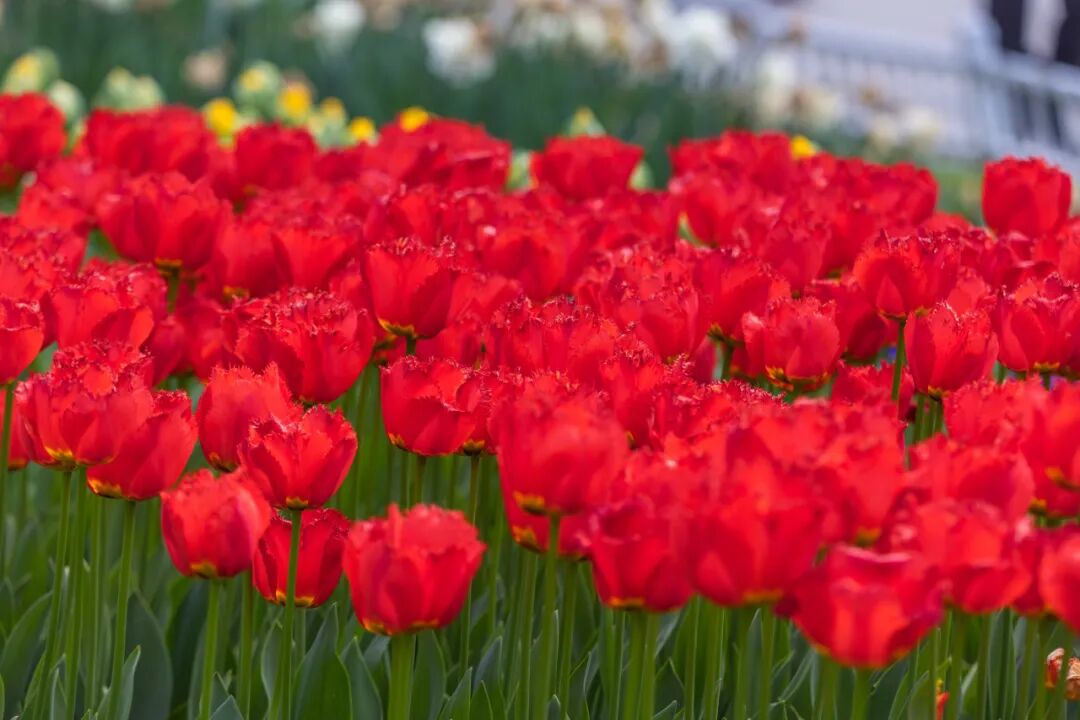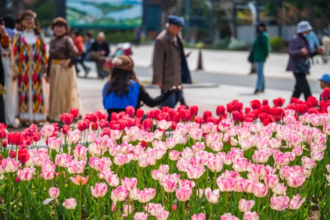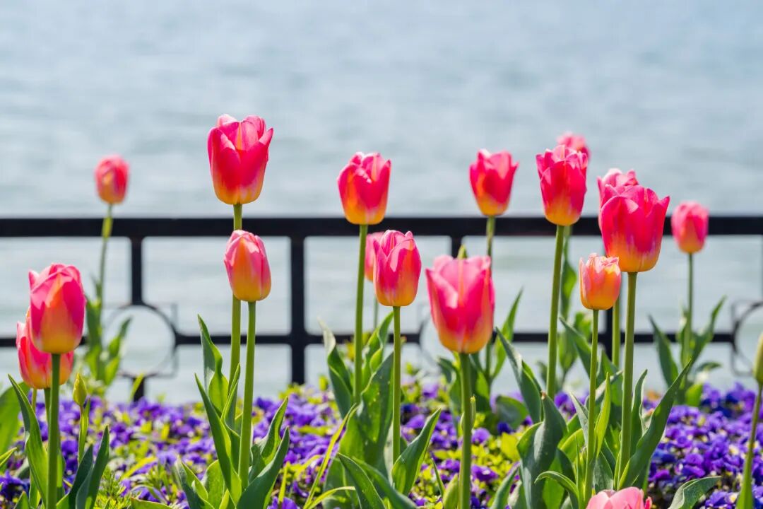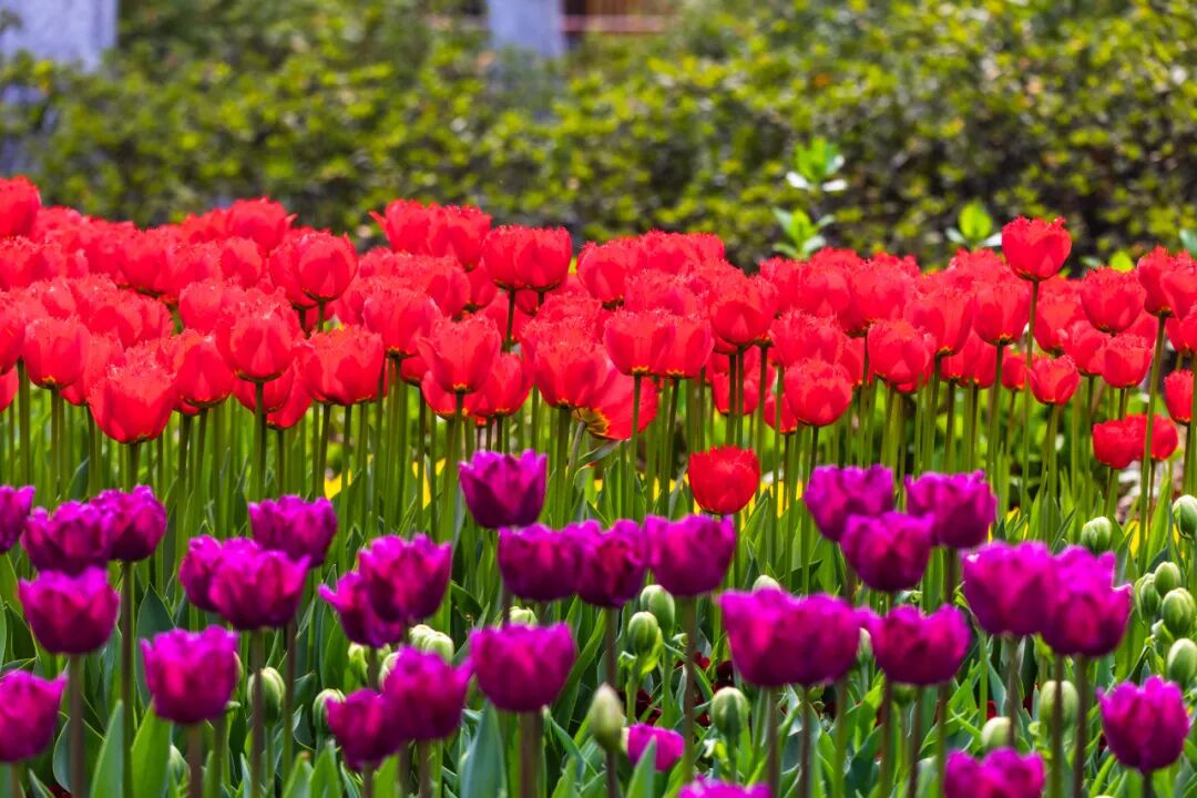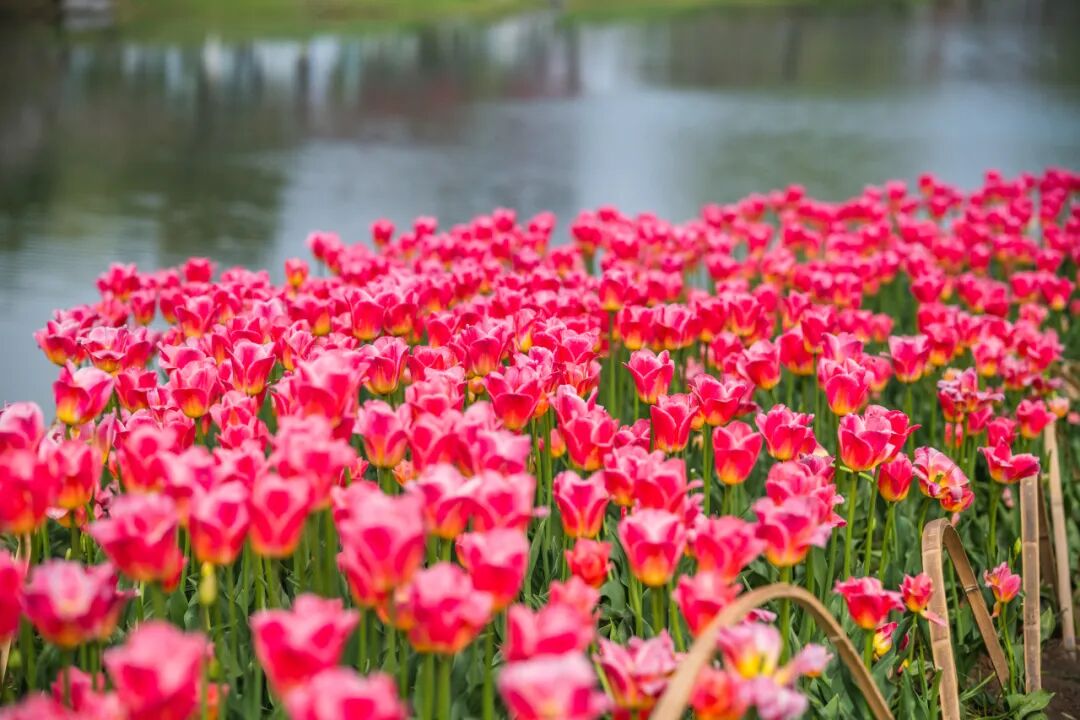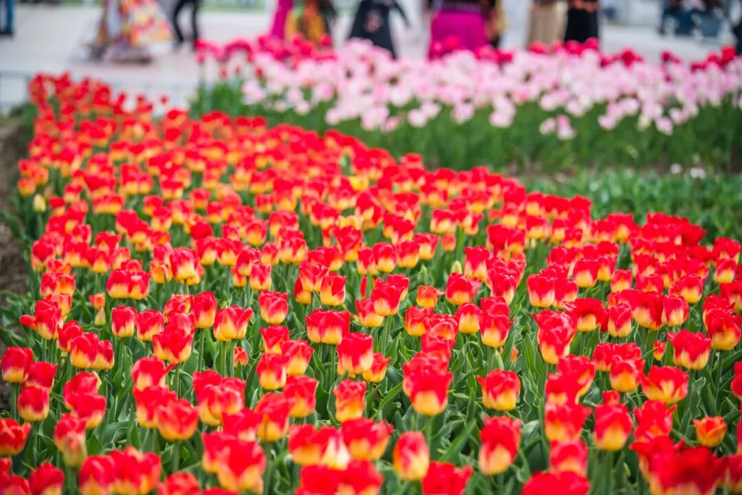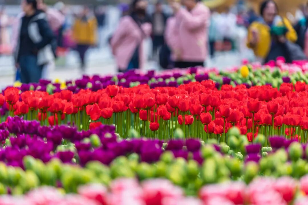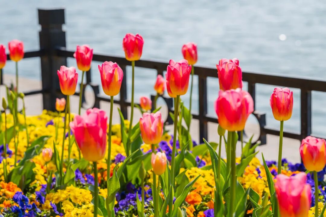 情侣园是郁金香的核心观赏区。花卉大道两侧、访花蝶径沿线及情侣园沿湖区域,大片郁金香肆意铺展、交错绽放。微风拂过,花浪轻摇,漫步其间,仿佛闯入一片浪漫的彩色秘境,目之所及皆是生机与美好。