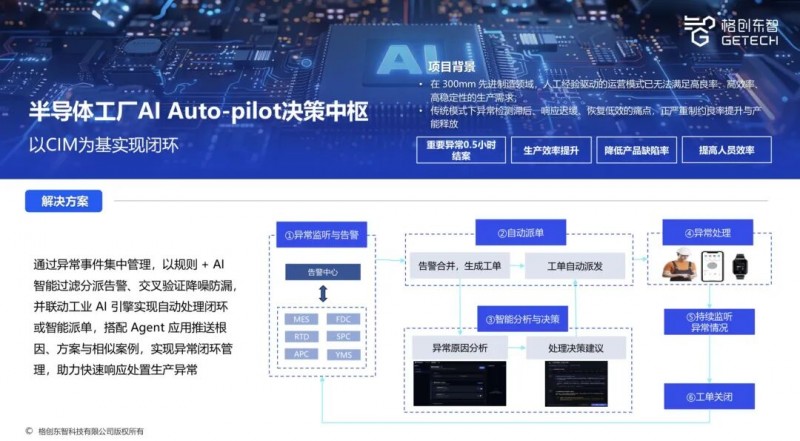 这些业务价值,均提炼自其服务全球龙头芯片厂、硅片厂及封测厂的真实项目。以服务某外资龙头芯片厂商构建AI Auto-pilot决策中枢为例,格创东智为客户部署了一个集合智能工单管理、可视化工作流逻辑编排、AI辅助决策与统一数据洞察的工业智能中枢,助力客户实现了生产告警的智能管理、自动分派、AI辅助根因分析和处置建议,达成重要异常“实时检测、0.5小时内恢复”的目标。种种实践表明,格创东智的工业AI体系已跨越验证阶段,具备成熟的交付能力与卓越的稳定性并进入价值兑现期。