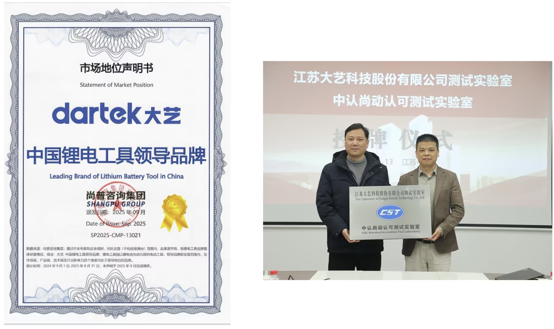 (图4:大艺科技先后荣获“中国锂电工具领导品牌”与“中认尚动认可测试实验室”)