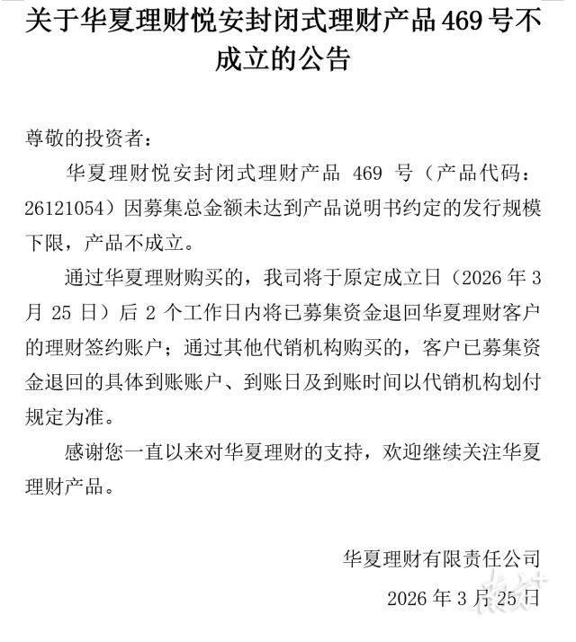 银行的理财产品不好卖了?25日,中信理财发布公告,公司的“信银理财安盈象固收稳益封闭式332号理财产品”因为认购金额未能达到理财产品说明书规定的规模下限(人民币500万元),根据约定,本期理财产品不成立。同日,华夏理财的悦安封闭式理财产品469号因募集总金额未达到约定,产品不成立。