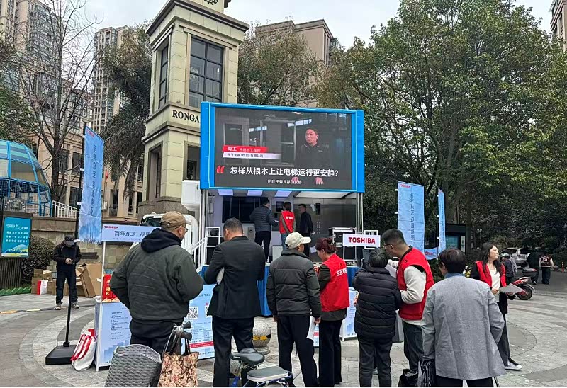 为了让居民沉浸式地感受到改造后的电梯,今年,东芝电梯把焕新体验馆开进了社区——不是展厅,不是发布会,而是把一部改造完成的实物电梯轿厢搬到小区门口,支起来让居民进去站站、摸摸、试试。目前已走进上海、宁波、杭州等城市的老旧小区。