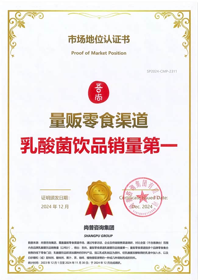 在零食渠道,吾尚与零食很忙、赵一鸣零食、零食有鸣、糖巢零食、老婆大人、戴永红、三只松鼠等百余家头部零食系统建立深度合作,打造“量贩零食×饮品”的创新模式。凭借质价比和高复购率,吾尚乳酸菌已成为众多零食系统的重点推广产品,年销售数亿元,并于2024年底成功斩获权威认证的 “量贩零食渠道乳酸菌饮品销量第一” 称号,不断深化"吾尚AD钙,更懂年轻新一代"标签。