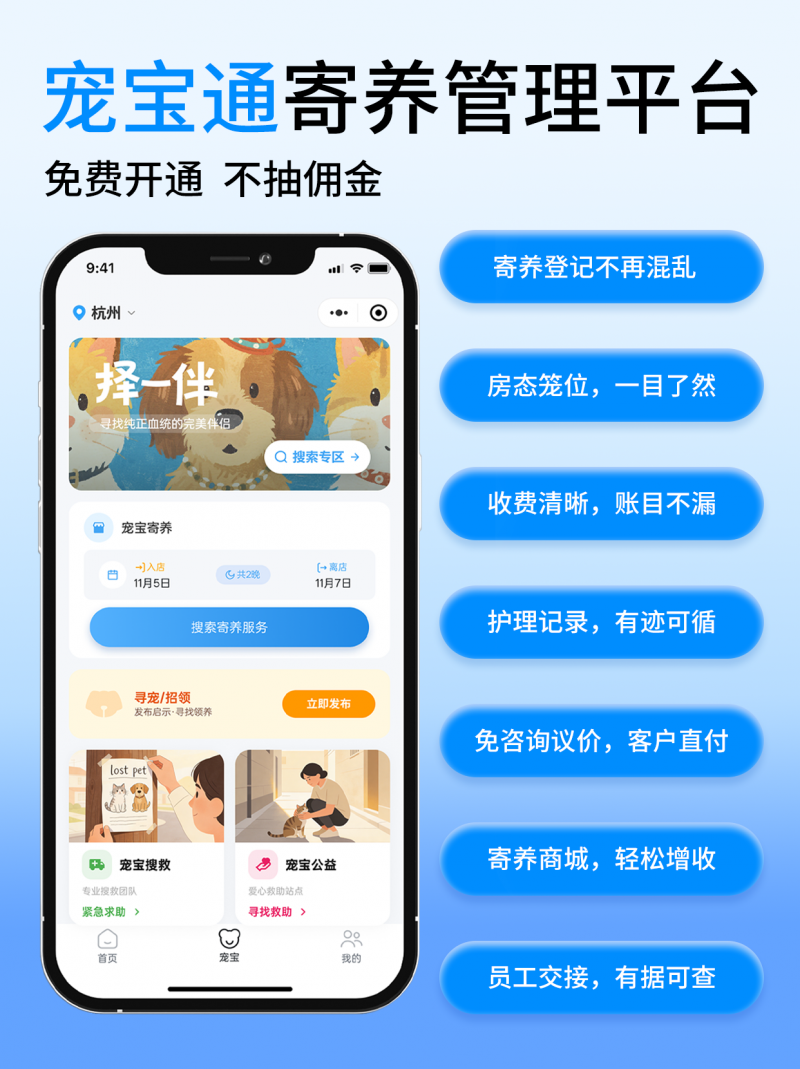 近日,由杭州互联网公司新秀万思奇科技有限公司打造的宠物寄养管理系统平台——“宠宝通”微信小程序正式上线。作为一款聚焦宠物寄养管理与宠物生活服务的数字化平台,宠宝通不仅为广大宠主提供更便捷、更安心的寄养预约、宠宝管理、寻宠与领养服务,也为宠物寄养行业带来了更加清晰的经营模式与增长机会。尤其值得关注的是,宠宝通的推出,为一批想低成本进入宠物行业的创业者,提供了一条更轻、更稳、更容易起步的发展路径。