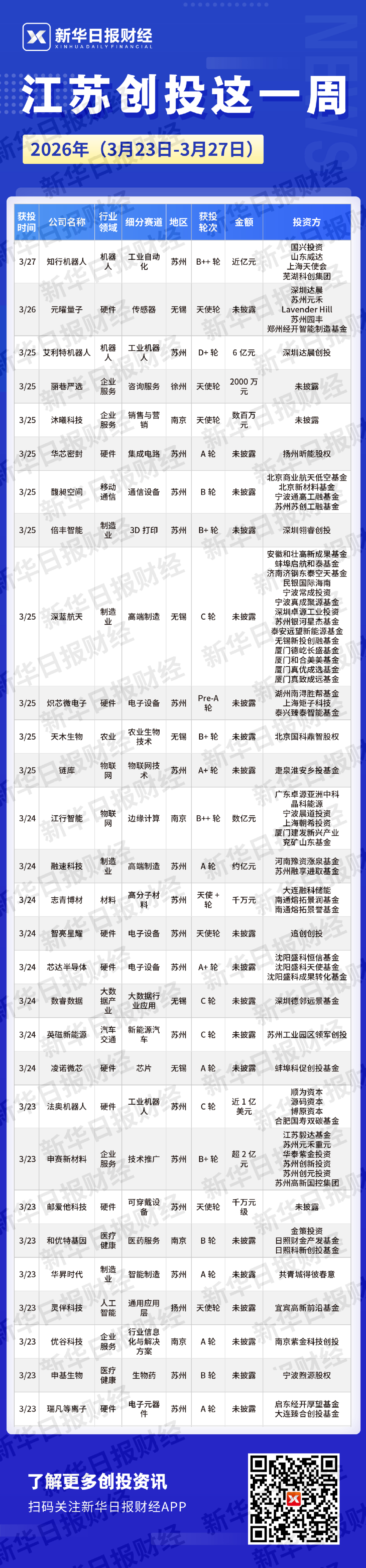 新华日报财经讯 本周(3月23日-3月27日),江苏共发生私募股权投融资事件29起,已披露的投融资总额近25亿元。具体来看,行业分布上,硬件9起,企业服务4起,制造业4起,机器人2起,物联网2起,医疗健康2起,材料1起,大数据产业1起,农业1起,汽车交通1起,人工智能1起,移动通信1起;投融资轮次上,A轮6起,天使轮6起,C轮4起,B+轮3起,B轮3起,A+轮2起,B++轮2起,D+轮1起,Pre-A轮1起,天使+轮1起;地域分布上,苏州18起,无锡5起,南京4起,徐州1起,扬州1起。