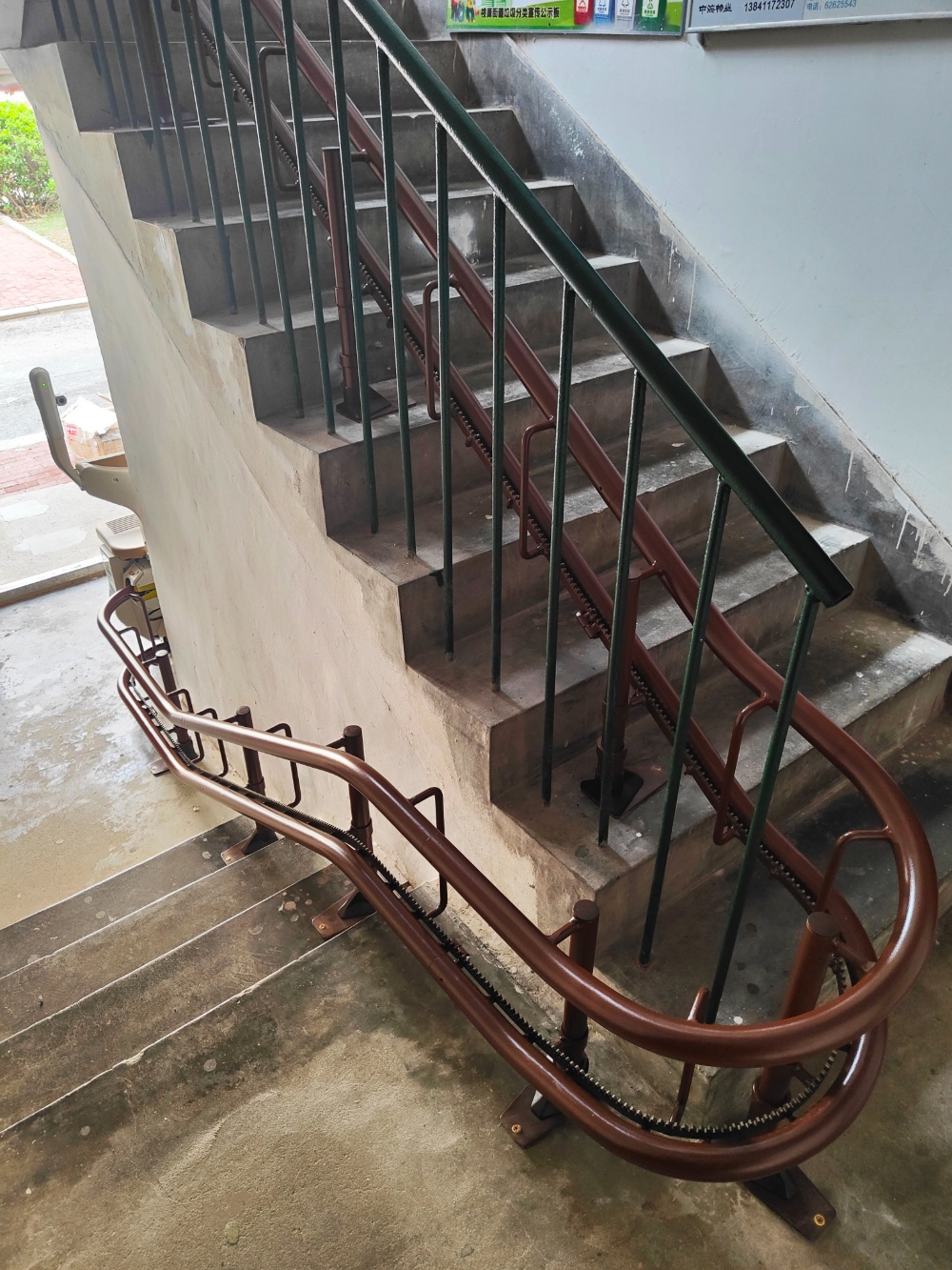 走进医校小区的楼道,一台崭新的楼道座椅电梯(楼梯升降椅)已然就位,沿着楼梯扶手一侧有序布设,与原有楼梯结构、楼道环境完美融合,没有丝毫突兀感,更没有破坏楼道的整体布局与美观。