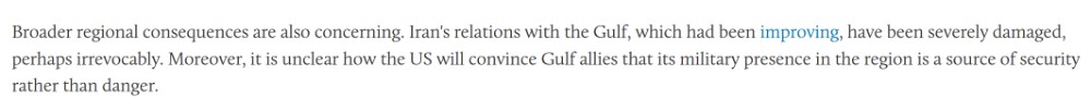 文章称,战争已经造成了深远的损害——成千上万人伤亡、基础设施广泛受损、经济危机加深等等——但一场旷日持久的战争将造成更大的后果。海湾国家已经被波及,复苏之路漫长。专家指出,战争结束后,更广泛的地区后果也令人担忧。伊朗与海湾国家本已改善的关系遭到严重破坏,或许无法挽回。此外,目前尚不清楚美国将如何说服海湾盟友其军事存在是安全的保障而非危险。