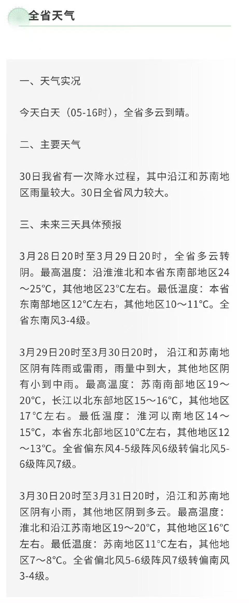 具体天气预报:3月28日20时至3月29日20时,全省多云转阴,最高温度沿淮淮北和本省东南部地区24~25℃,其他地区23℃左右,最低温度本省东南部地区12℃左右,其他地区10~11℃,全省东南风3—4级。3月29日20时至3月30日20时,沿江和苏南地区阴有阵雨或雷雨,雨量中到大,其他地区阴有小到中雨,最高温度苏南南部地区19~20℃,长江以北东部地区15~16℃,其他地区17℃左右,最低温度淮河以南地区14~15℃,本省东北部地区10左右,其他地区12~13℃,全省偏东风4—5级阵风6级转偏北风5—6级阵风7级。3月30日20时至3月31日20时,沿江和苏南地区阴有小雨,其他地区阴到多云,最高温度淮北和沿江苏南地区19~20℃,其他地区16℃左右,最低温度苏南地区11℃左右,其他地区7~8℃,全省偏北风5—6级阵风7级转偏南风3—4级。