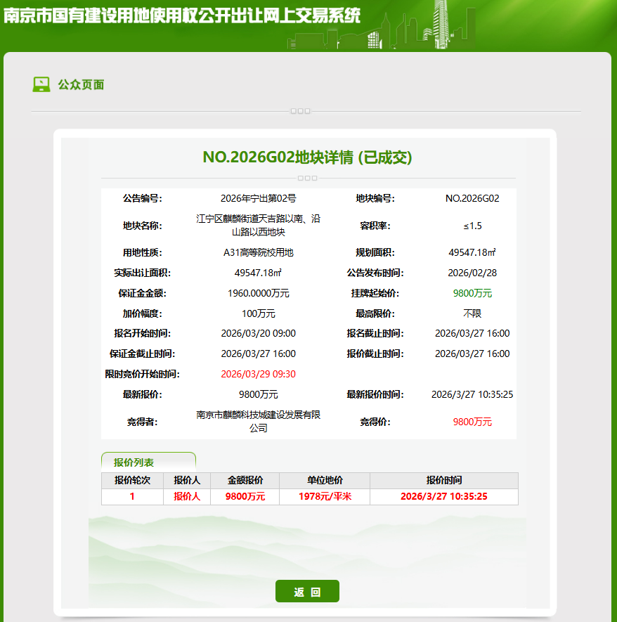 此外,江北新区成交2幅住宅用地(用于建设房票房源)和1幅商办用地,其中,NO.新区2026G01住宅地块、NO.新区2026G02住宅地块由新居建设集团分别以总价0.2234亿元、4.3669亿元竞得,NO.新区2026G05商办地块由民企南京之太商业管理有限公司以总价0.206亿元竞得;溧水成交3幅住宅用地,其中,NO.溧水2026G01、G03地块由大成房地产分别以总价2亿元、2.19亿元竞得,NO.溧水2026G02由润科置业以总价1.28亿元竞得。