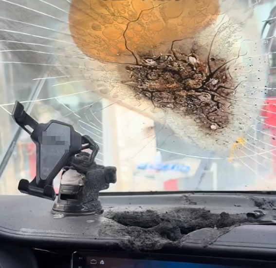 前挡风玻璃也裂成了“蛛网”