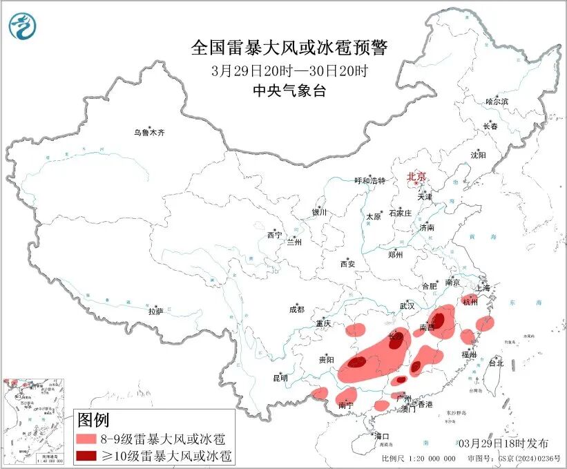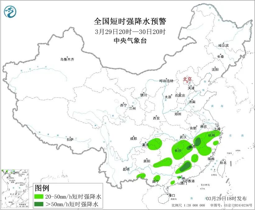 西南地区东部、江南、华南等地的部分地区将有小时雨量大于20毫米的短时强降水天气,其中,江西北部和西南部、广东北部等地的部分地区小时雨量大于50毫米,最大可达80毫米以上。