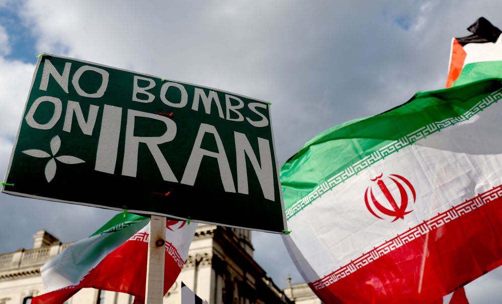 2月28日,民众在英国伦敦议会广场举行示威,抗议美国和以色列军事打击伊朗。新华社记者李颖摄