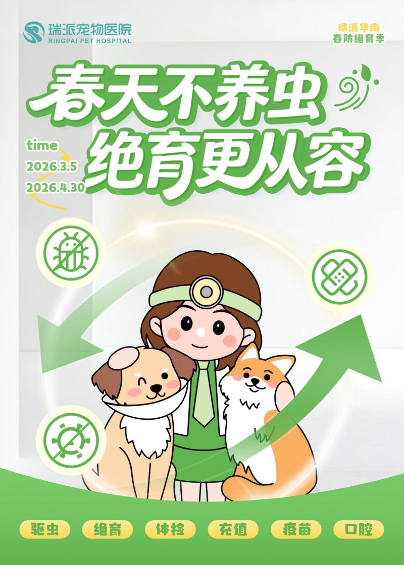 春日来临,宠物春季防疫养护进入关键阶段。瑞派南华紧扣春日宠物健康需求,于3月5日至4月30日开启2026春季宠物健康防护服务,覆盖驱虫、绝育、体检、洁牙、充值、疫苗、宠物口粮七大核心板块,联动美团、官方小程序打造线上线下一体化服务体系,以专业、多元、贴心的健康服务,全方位守护爱宠春日健康。