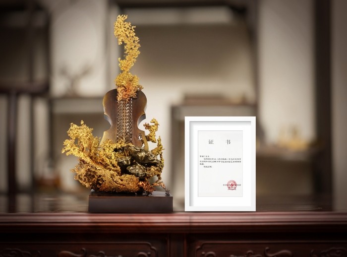 本次被收藏的《情深和鸣》,正是朱炳仁熔铜“小提琴”系列的经典之作。作品取小提琴之形,寓“乐为心声”之意,以熔塑技法勾勒莲荷云纹,熔铜肌理自然跌宕、独一无二,尽显东方造物的诗意与哲思。“情深”里藏拳拳心意与文化共情,“和鸣”则契知己共鸣与文明相知。整件作品,既传递出同心共济友好情谊,也成为中德文化交流的生动载体。