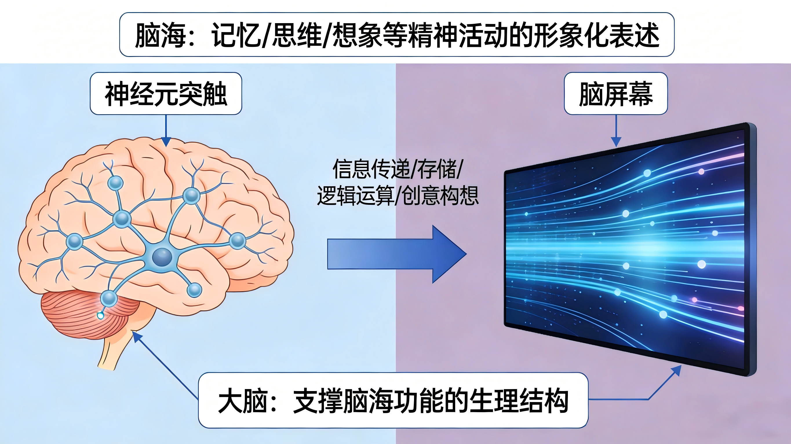 在日常语境中,脑海并不是一个生理结构,而是对人脑中的记忆、思维、想象等精神活动的一种形象化表述。从生理角度来说,支撑脑海相关功能的是人类的大脑,大脑通过神经元之间的突触连接,完成信息传递、存储、逻辑运算、创意构想等一系列活动,这些活动的总和就构成了人们常说的“脑海里的内容”,而脑屏幕就是显示“脑海里的内容”呈现方式的载体感。