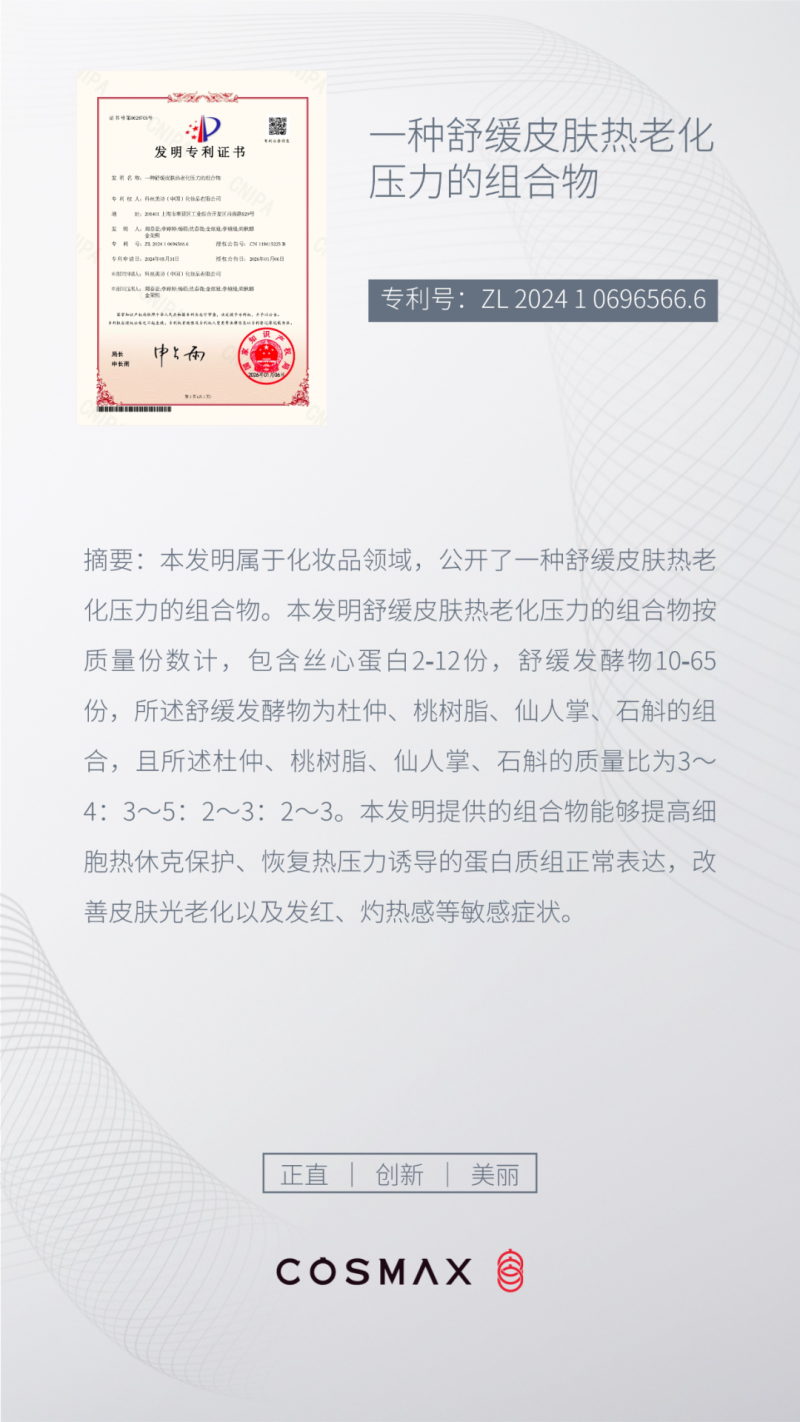 围绕这一问题,科丝美诗在最新申请的发明专利中提出了一种新的技术路径——通过生物活性组合物,干预皮肤在热压力下的应激反应过程,从而实现对“热老化”的系统性调节。
