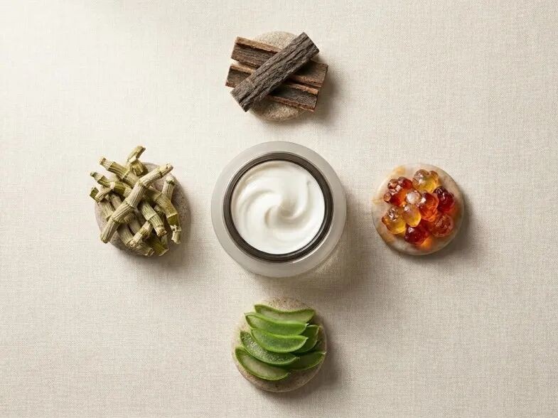 该组合物以丝心蛋白为核心,同时结合来源于杜仲、桃树脂、仙人掌与石斛的植物发酵体系。前者与人体皮肤氨基酸组成相近,具有良好的生物相容性与成膜性;后者则富含多糖及活性成分,在舒缓与屏障支持方面表现稳定。两者的协同,使这一体系不仅停留在“物理降温”,而是进一步作用于细胞层面的应激机制。