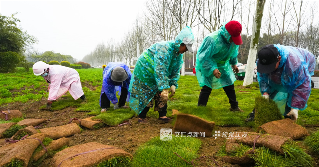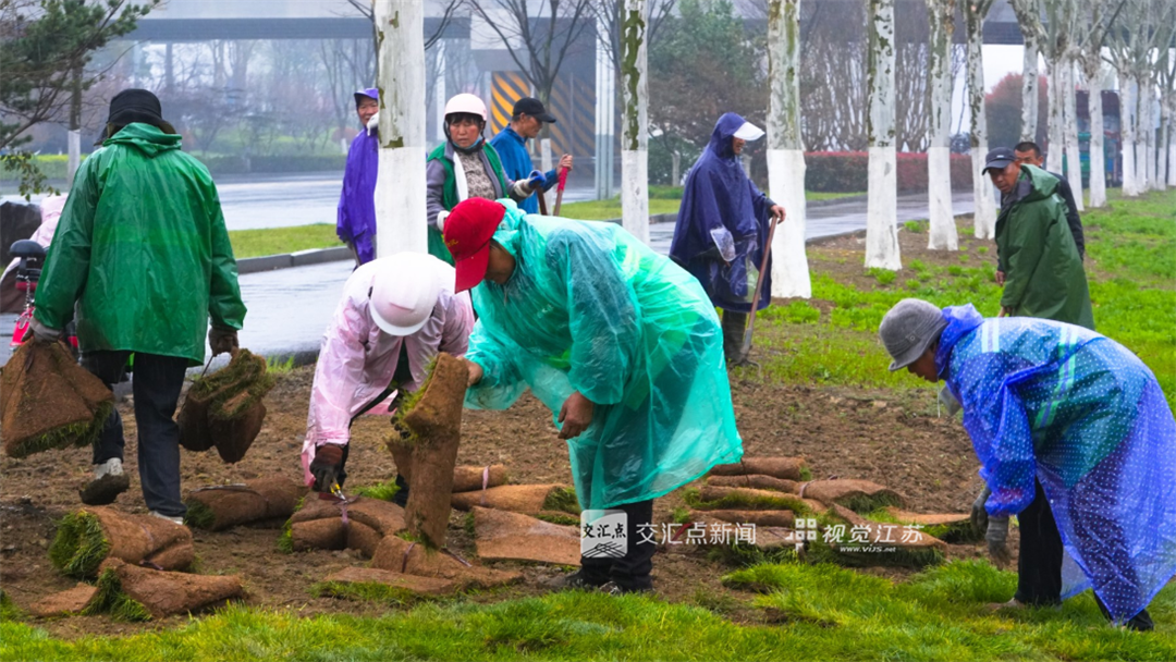 (特约摄影 汪红兵 07:19摄 09:17上线)3月30日,天空下着细雨,宿迁市泗洪县青临线高架桥西侧园林绿化人员正在整理地面,铺设草坪。