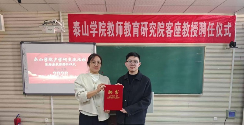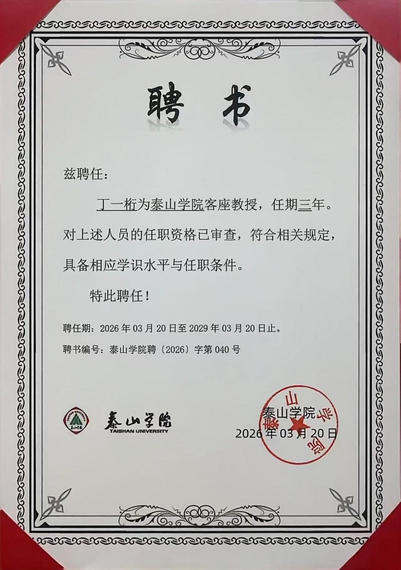 【2026年3月20日】今日,泰山学院举行聘任仪式,正式聘请知名考研培训专家、明悦教育创始人丁一桁先生为该校客座教授。泰山学院相关领导出席仪式并为丁一桁颁发聘书,学校教务处、学生工作处及部分二级学院负责人参加聘任仪式。