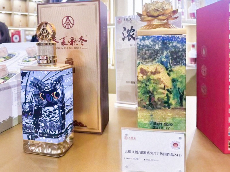 △五粮文创盛世和美纪念酒(左)/五粮液股份春夏秋冬月光曲(中)/五粮文创镶器系列(丁传国作品)(右)