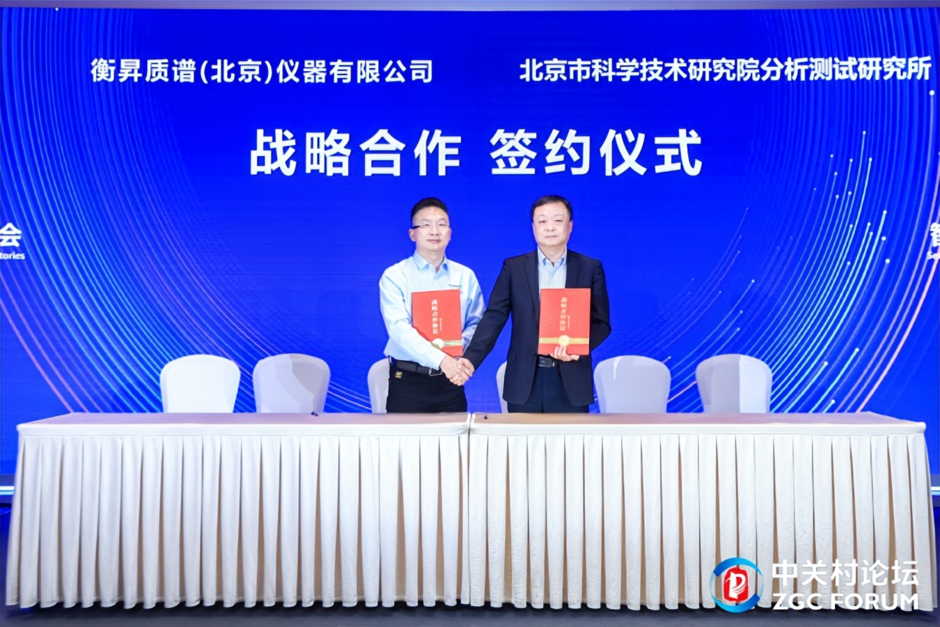 (北京市科学技术研究院分析测试研究所党委书记 张积锐与衡昇质谱总经理 祝敏捷 签约)