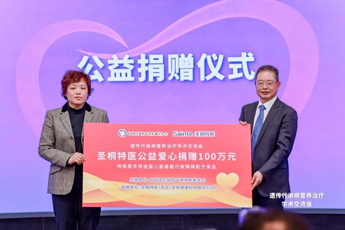 会上,圣桐特医的公益爱心再次延续,宣布将继续向中国出生缺陷干预救助基金会捐赠价值100万元的特爱丙佳特殊医学用途婴儿氨基酸代谢障碍配方食品。精准帮扶困境家庭,多方共筑罕见病患儿喂养的保障网——让生命不再“断粮”。