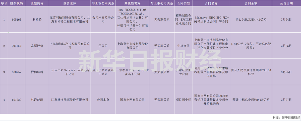 3月24日,江苏利柏特股份有限公司发布公告,公司近日与NOV PROCESS & FLOW TECHNOLOGIES AS签订了《Sakarya 3MEG EPC PKG-91模块制造合同》,合同金额约2000万美元(折合人民币约1.44亿元);公司全资子公司上海利柏特工程技术有限公司分别与艾仕得涂料(吉林)有限公司签订了《APAC 树脂项目EPC工程总承包合同》,合同金额为人民币1.70亿元;与林德气体(嘉兴)有限公司签订了《嘉兴ESS空分项目EPC工程总承包合同》,合同金额为人民币1.10亿元至1.30亿元(最终以竣工结算数额为准)。三项合同合计金额折合人民币约4.24亿元至4.44亿元,履行期限分别为15个月、20个月和15个月。上述合同的顺利履行将对公司当期及未来业绩产生积极影响。