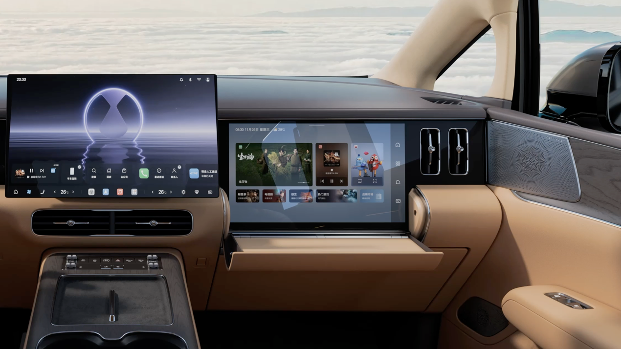副驾配备的开合智能屏,满足多场景娱乐需求:平时可以放歌、刷短视频;想要观影时,翻下大屏,尽享沉浸式观影体验。贴心的是,翻下来的小桌板还可放置太阳镜、耳机等随身物件,细节处见豪华。