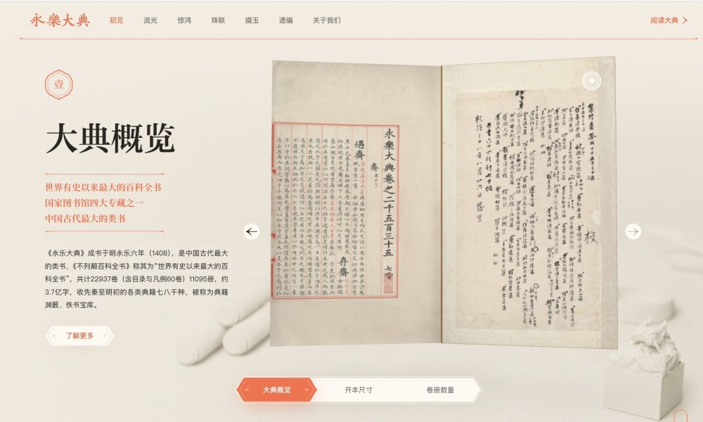 《永乐大典》高清影像数据库项目(第一辑)以其对经典古籍《永乐大典》的数字化生动呈现、便利化传播以及知识体系化、智能化探索,从众多申报作品中脱颖而出,获得“网络出版物”奖项。数字化后的《永乐大典》(第一辑)包括75卷内容,共涉及14个韵部、17个韵字、1800部书。读者可通过“识典古籍”平台浏览大典的高清图像、原文引文,直观感受内页纸张质感,了解其流散轨迹、分布状态与流转历程。