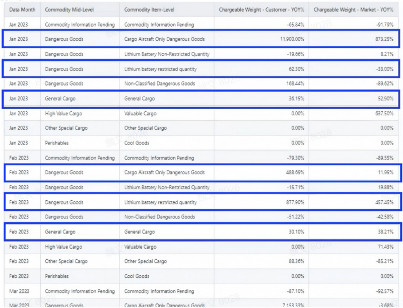 小项下探:进一步查看危险品子类,发现“仅限货机危险品”在2023年初出现爆发式增长(1月同比+11,900%,2月+488%),且企业已有参与。这表明该航线在特定商品上存在高速增长赛道,企业可集中资源抢占份额。