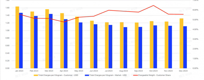 3000-5000kg级别段的运价全年稳定在1.05-1.15美元/公斤之间,而企业凭借货量优势已拿到0.91美元/公斤的优惠价;
