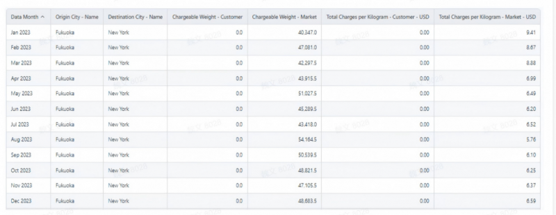 数据显示,福冈-纽约航线全年货量稳定在4-5.4万公斤/月,无明显淡旺季,运价虽年初较高但随后回落至6-7美元/公斤区间,属于健康稳定的市场,值得投入资源拓展。
