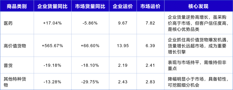结论:企业应将资源向医药、高价值货物等自身优势明显、增长快的领域倾斜,同时关注特种货物中的潜力点。