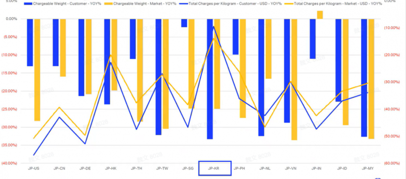 企业调取了2023年从日本始发至前15大贸易目的地的年度数据,将自身货量、市场份额、采购价格与市场平均水平进行对比:
