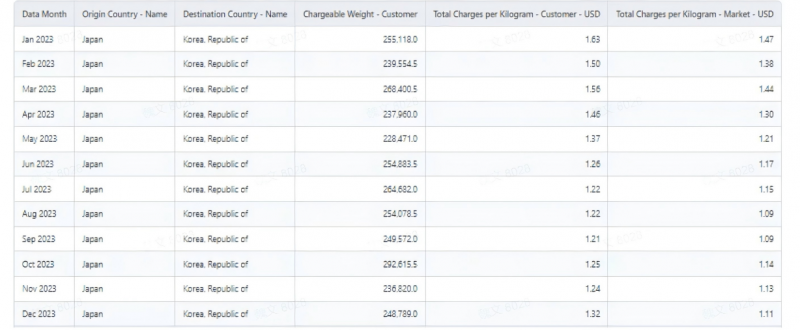 为验证假设,企业利用CargoIS时间轴功能,调取了2023年日本-韩国航线的月度数据,追踪自身份额、运价与市场平均运价的动态关系: