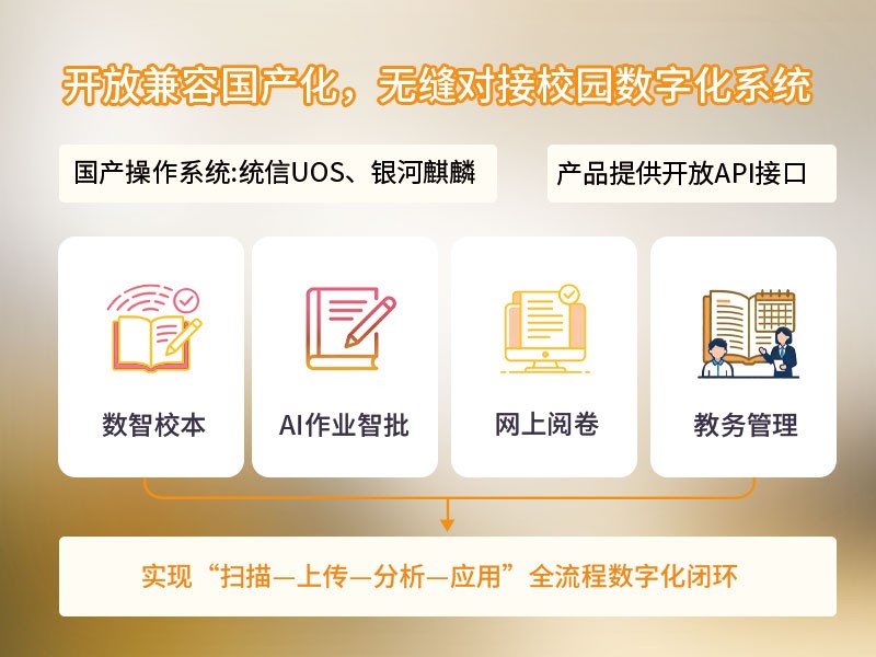 作为教育数字化关键衔接设备,eScan系列全面适配统信UOS、银河麒麟等国产操作系统,契合教育信息化国产化要求,保障校园数据安全。产品提供开放API接口,可无缝对接数智校本、AI作业智批、网上阅卷、教务管理等主流教育系统,无需重构现有IT架构,即可实现“扫描—上传—分析—应用”全流程数字化闭环,让数据高效流转。