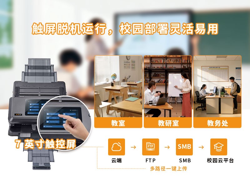在操作与部署上,eScan系列充分贴合校园使用习惯。设备配备7英寸高清触控屏,预览、裁剪、优化等操作一键完成,教师无需专业培训即可快速上手。同时支持无线脱机独立运行,摆脱电脑束缚,可灵活部署在教室、教研室、教务处等场所,插电即用。扫描数据支持云端、FTP、SMB、校园云平台等多路径一键上传,方便教研组即时共享,显著提升协作效率。