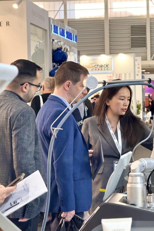 卓越的产品力吸引了大量专业观众、诊所代表及采购商驻足。大家争相上手体验,亲身感受GSD产品的精准度与舒适性,对设备的技术参数、临床应用效果及操作便捷性给予高度评价。与此同时,来自欧洲、中东、亚太等全球各地的客商与吉斯迪团队进行了深入对话。双方围绕技术细节、临床应用前景及市场合作模式进行了全方位的专业沟通,现场气氛热烈,充分彰显了国际市场对中国高端医美设备品牌的强烈认可与合作信心。
