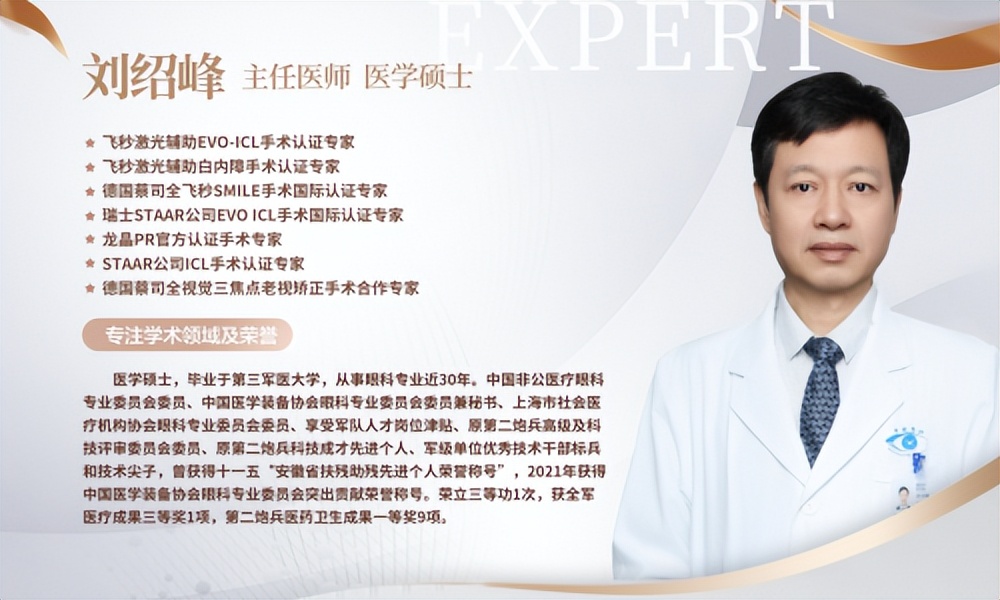 作为国内屈光矫正领域的资深专家,刘绍峰院长从事眼科专业近 30 年,拥有医学硕士学位,同时身兼德国蔡司全飞秒 SMILE 国际认证专家、STAAR 公司 ICL 手术认证专家、德国蔡司全视觉三焦点老视矫正手术合作专家等多项专业资质,还曾享受军队人才岗位津贴,斩获全军医疗成果三等奖、第二炮兵医药卫生成果一等奖等多项荣誉,是中国医学装备眼科专业委员会屈光不正秘书。从全飞秒、半飞秒到 ICL 晶体植入,从常规近视矫正到老视矫正、二次屈光修复,刘绍峰院长精通各类屈光手术术式,尤其擅长为复杂眼况患者“量眼定制”矫正方案,累计为众多近视合并老视、角膜条件特殊、二次矫正的患者成功摘镜,用扎实的临床经验和精准的手术技术,赢得了患者的广泛认可。
