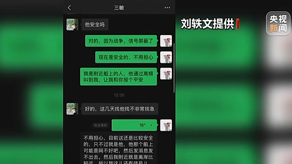 至今,一些船员家属短暂听到亲人声音后,在没办法跟亲人保持联系时,还会偶尔给刘轶文发微信。刘轶文也会分享他周围海面上的情况,希望能让对方稍稍安心。
