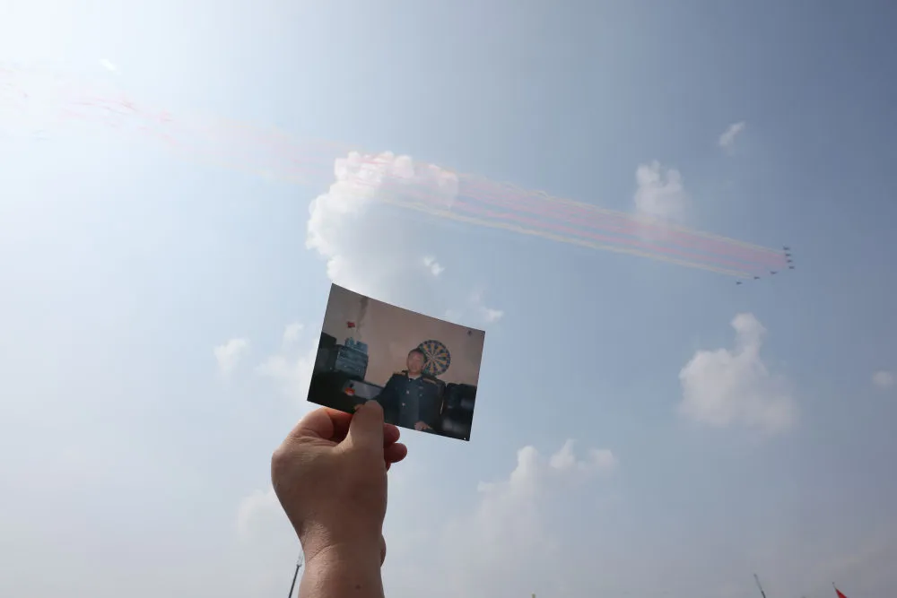在观礼台上把王伟的照片举向蓝天