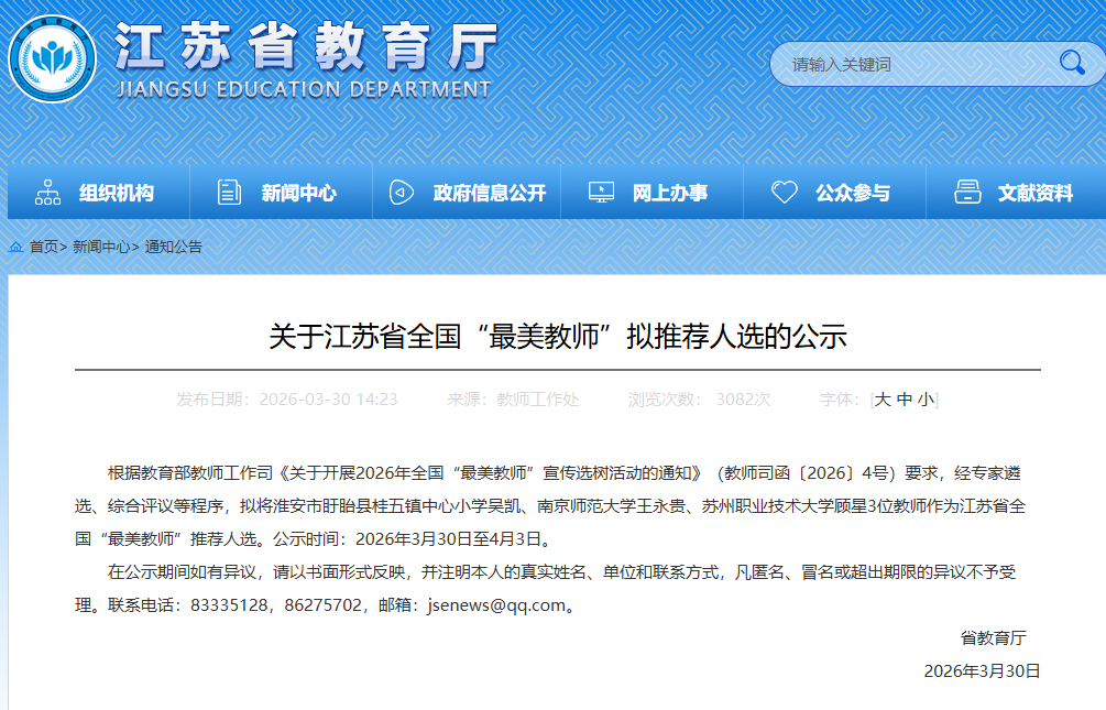 3月30日,江苏省教育厅发布了《关于江苏省全国“最美教师”拟推荐人选的公示》,拟将淮安市盱眙县桂五镇中心小学吴凯、南京师范大学王永贵、苏州职业技术大学顾星3位教师作为江苏省全国“最美教师”推荐人选。公示时间:2026年3月30日至4月3日。